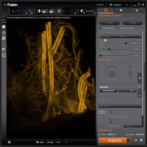 每個(gè)Windows用戶,在通道設(shè)置和成像模式存儲(chǔ)為重復(fù)使用前,可以從成像模式中增加通道并根據(jù)你的需求調(diào)整方案。通過(guò)Fusion軟件可以提前計(jì)劃你的實(shí)驗(yàn),將系統(tǒng)置于準(zhǔn)備狀態(tài),一旦啟動(dòng)命令就能開(kāi)始成像。