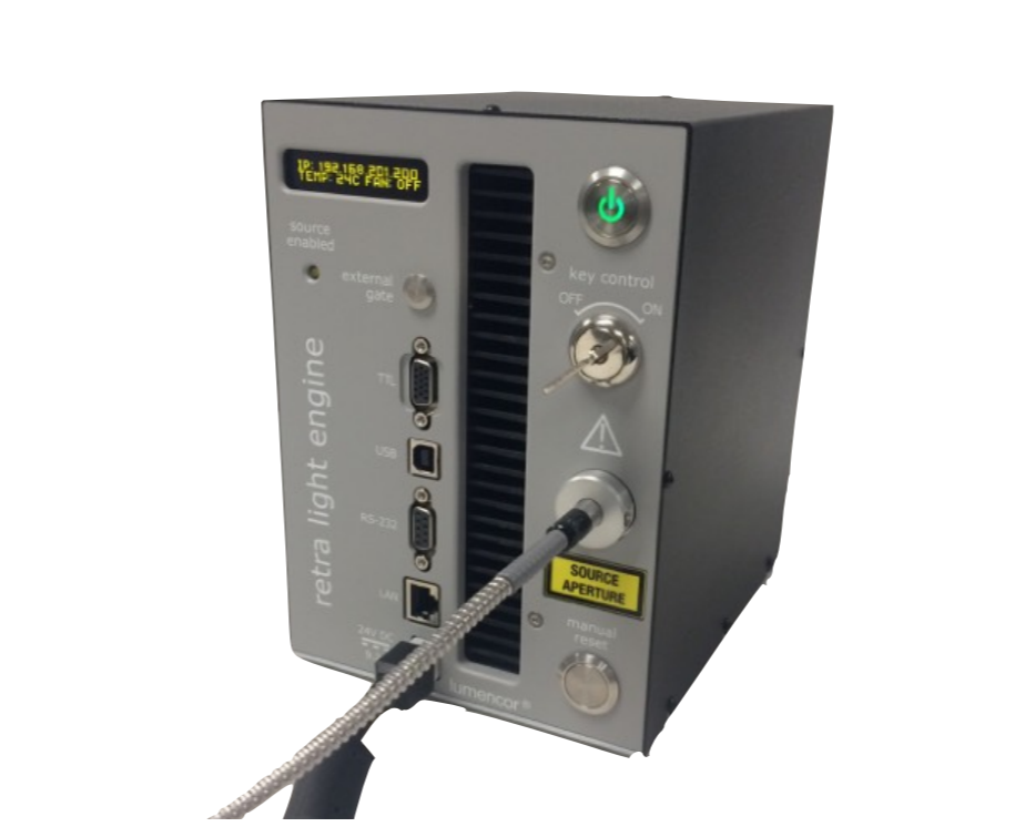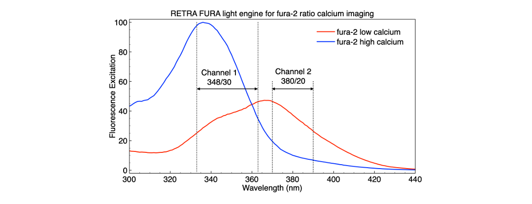 Lumencor的RETRA光引擎是專為生物分析研究人員和/或生物光學儀器開發人員在實驗室使用而設計的。RETRA結合了兩個獨立可控的固態光源以及相關的帶通濾光片,可產生光譜離散的輸出。根據特定應用的要求,光譜輸出可以位于從紫外線到可見光再到近紅外的范圍內。例如,RETRA FURA光引擎可提供340 nm和380 nm的輸出,用于fura-2鈣離子成像。RETRA光引擎可以通過串行命令進行開/關切換和強度控制,也可以通過TTL觸發進行光源選擇和開/關切換。